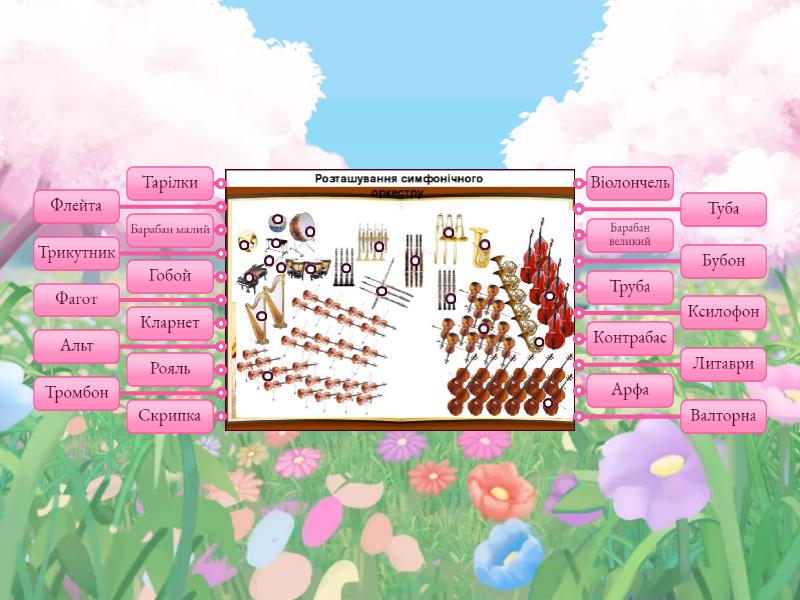 Скрипка, Альт , Віолончель, Контрабас, Флейта, Кларнет, Гобой, Фагот, Труба, Тромбон, Валторна, Туба, Барабан малий, Барабан великий, Ксилофон, Трикутник, Литаври, Бубон, Арфа, Тарілки, Рояль.
