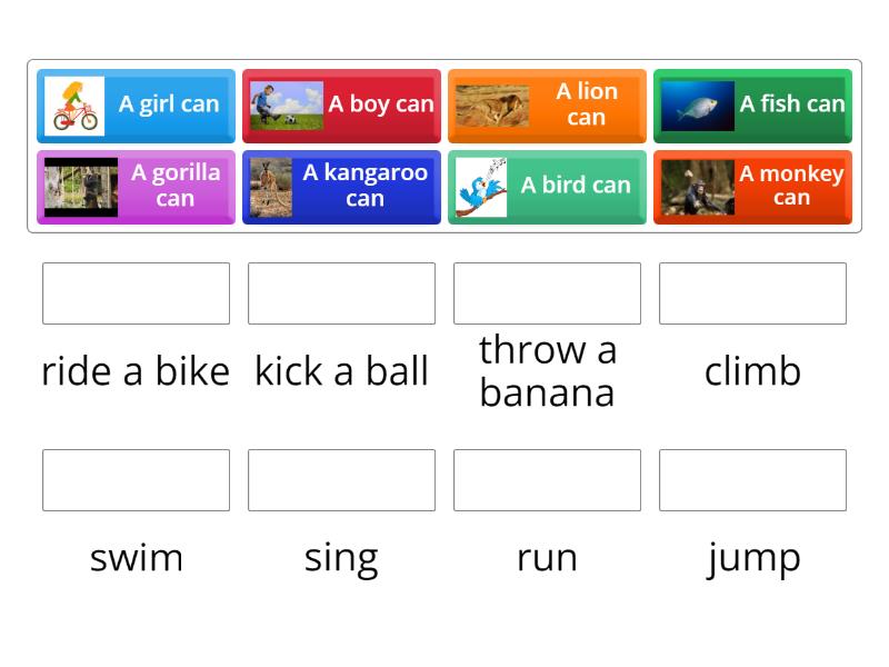 A gorilla can - climb, A lion can - run, A kangaroo can - jump, A monkey can - throw a banana, A bird can - sing, A fish can - swim, A boy can - kick a ball, A girl can - ride a bike,