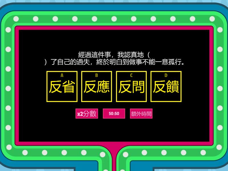 1) 經過這件事,我認真地( )了自己的過失,終於明白到做事不能一意孤行。 a) 反省 b) 反應 c) 反問 d) 反饋 2) 這座新會堂的面積是舊會堂的三倍,能同時( )三千名觀衆 a) 囊括 b) 包含 c) 包羅 d) 容納 3) 從小就喜歡看書的哥哥寫起文章來總是( )自如,運筆如神。 a) 操作 b) 揮灑 c) 舞動 d) 使用 4) 舉辦這個展覽是爲了( )環保的理念,主辦機構希望大家齊心保護地球。 a) 宣稱 b) 宣佈 c) 宣揚 d) 宣泄 5) 最近一項研究指出,從仙鶴草等三種藥用植物中( )出來的化學物質,有助治療肝癌。 a) 提煉 b) 獲取 c) 挖掘 d) 發現 6) 他是個認真負責的人,對於自己所犯的過錯都勇於( ),決不會推卸責任。 a) 背負 b) 承擔 c) 接受 d) 贊同 7) 雖然政府已不斷提醒市民小心火種,但仍未能( )人們在地上燃燒冥鏹的情況。 a) 杜絕 b) 終結 c) 禁止 d) 結束