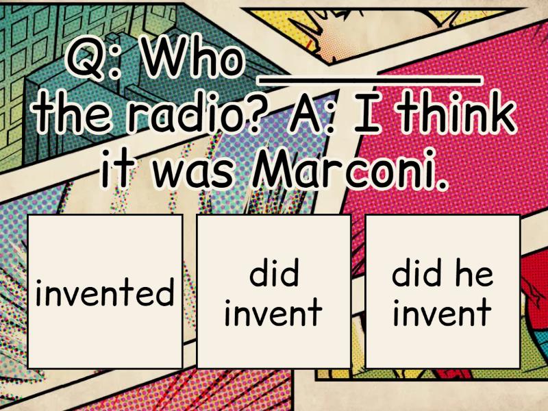 1) Q: Who _______ the radio? A: I think it was Marconi. a) invented b) did invent c) did he invent 2) Q: What __________ Antonio Marconi________? A: I'm sure he invented the radio. a) did/invented b) did/invent c) -/invented 3) Tick the correct question: a) What did happen at the party? b) Who does live next door? c) Who phoned me this morning? 4) Q: Who _____________ the email? A: Me! Please, can you send it again? a) not received b) did you receive c) didn't receive 5) How many people in the world __________________? a) speak Chinese b) do they speak Chinese? c) do speak Chinese 6) Can you remember when __________ your mobile phone? a) you bought b) did you buy c) you did buy 7) Do you think _________ travel on holiday this year? a) will you b) you are c) you will 8) Have you any idea where _____________? a) is Robert b) Robert is c) does Robert be 9) Q: Who do you usually go on holiday _______? A: My parents, of course. a) about b) to c) with 10) Q: What are you looking _____ ? A: My glasses-I can't find them anywhere! a) at b) for c) on 11) Q: How long have you been waiting ______? A: About thirty minutes. a) for b) at c) in 12) Q: Who has ______ the cake? A: I don't know. It wasn't me! a) eat b) ate c) eaten