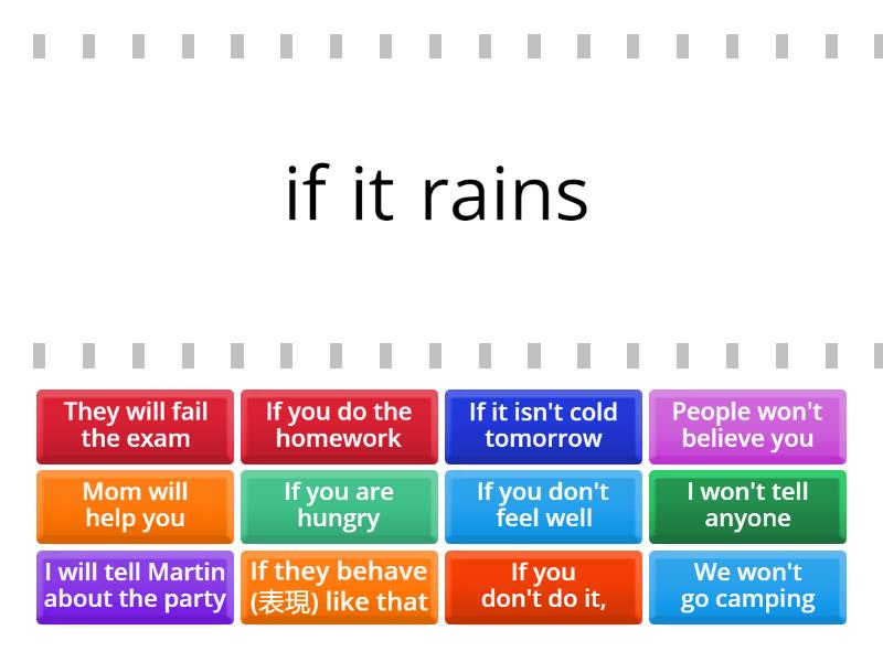 We won't go camping - if it rains, They will fail the exam - if they don't start studying now, Mom will help you - if you ask her, I won't tell anyone - if you want to keep it secret, People won't believe you - if you lie all the time, If it isn't cold tomorrow - I will wear that T-shirt., If you are hungry - I will make you a sandwich, If you don't do it, - I will tell Dad, I will tell Martin about the party - if I see him, If you don't feel well - I will take you to the hospital, If you do the homework - you will be able to use your cellphone, If they behave (表現) like that - they will not be able to go to the party on Sunday,