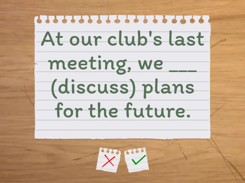 Yesterday, I ___ (go) to the cinema and watched a new film. - Yesterday, I went (go) to the cinema and watched a new film., ____ she ____ (cook) dinner yesterday? - Did she cook (cook) dinner yesterday?, What film ____ you ____ (watch) at the cinema? - What film did you watch (watch) at the cinema?, Where ____ they _____ (go) last weekend? - Where did they go (go) last weekend?, Last week, we ___ (visit) the art museum and enjoyed the exhibition. - Last week, we visited (visit) the art museum and enjoyed the exhibition., My brother ___ (buy) a new car and immediately went for a test drive. - My brother bought (buy) a new car and immediately went for a test drive., I _____(not go) to the cinema yesterday. - I didn't go (not go) to the cinema yesterday., My friends and I ____ (not visit) the museum last week. - My friends and I didn't visit (not visit) the museum last week., She _______ (not cook) dinner yesterday. - She didn't cook (not cook) dinner yesterday., At our club's last meeting, we ___ (discuss) plans for the future. - At our club's last meeting, we discussed (discuss) plans for the future.,