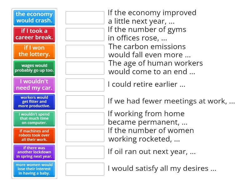 workers would get fitter and more productive. - If the number of gyms in offices rose, ..., more women would lose their interest in having a baby. - If the number of women working rocketed, ..., I wouldn't spend that much time on computer. - If we had fewer meetings at work, ..., if I won the lottery. - I could retire earlier ..., if I took a career break. - I would satisfy all my desires ..., I wouldn't need my car. - If working from home became permanent, ... , if machines and robots took over all their work. - The age of human workers would come to an end ..., the economy would crash. - If oil ran out next year, ..., wages would probably go up too. - If the economy improved a little next year, ..., if there was another lockdown in spring next year. - The carbon emissions would fall even more ...,