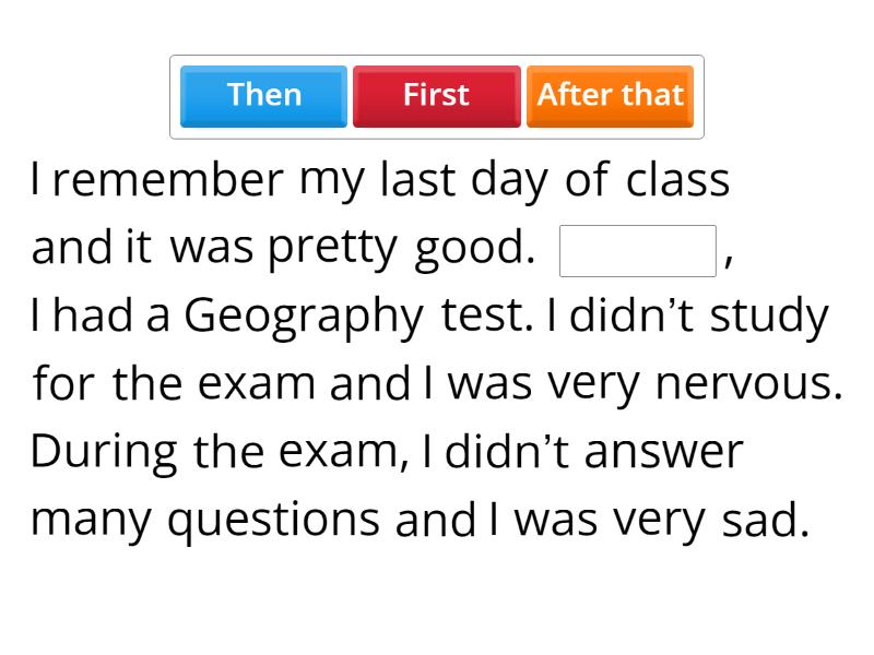 I remember my last day of class and it was pretty good. ____, I had a Geography test. I didn’t study for the exam and I was very nervous. During the exam, I didn’t answer many questions and I was very sad. ____, I had Science. I like Science and I did a very good job in the science lab. My experiment got a very good score and I was the star of the class! ____, I had recess. I love playing basketball so I played it with all my friends. ____, I had P.E. We ran for some minutes. ____, we did a lot of exercises in the patio. I was very tired! ____, I had English classes and the English teacher had a surprise for me! I got a 20 for my homework. I was so happy and I went to my house to celebrate with my family. I really loved that day ____ I spent good moments there.