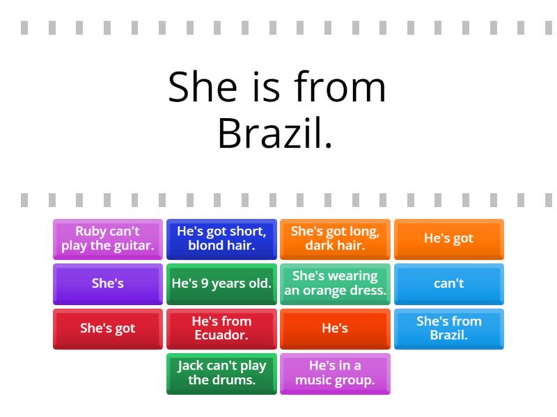 She's from Brazil. - She is from Brazil., He's from Ecuador. - He is from Ecuador., She's got long, dark hair. - She has got long, dark hair., Jack can't play the drums. - Jack cannot play the drums., Ruby can't play the guitar. - Ruby cannot play the guitar., He's got short, blond hair. - He has got short, blond hair., She's wearing an orange dress. - She is wearing an orange dress., He's - He is, She's - She is, can't - cannot, She's got - She has got, He's got - He has got, He's 9 years old. - He is 9 years old., He's in a music group. - He is in a music group.,