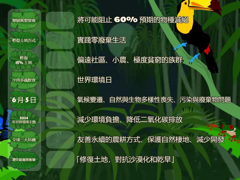 修復土地方式 - 友善永續的農耕方式、保護自然棲地、減少開發, 2024 年世界環境主題 - 「修復土地,對抗沙漠化和乾旱」, 6 月 5 日 - 世界環境日, 全球三大危機 - 氣候變遷、自然與生物多樣性喪失、污染與廢棄物問題, 遭受最嚴重衝擊 - 偏遠社區、小農、極度貧窮的族群, 舉辦無塑聚會 - 實踐零廢棄生活, 少肉多蔬飲食 - 減少環境負擔、降低二氧化碳排放, 修復 15% 土地 - 將可能阻止 60% 預期的物種滅絕,