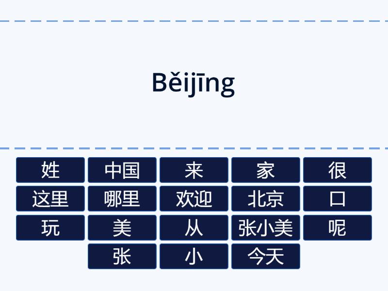 北京 - Běijīng, 中国 - Zhōngguó, 从 - cóng, 来 - lái, 姓 - xìng, 呢 - ne, 家 - jiā, 口 - kǒu, 玩 - wán, 今天 - jīntiān, 很 - hěn, 张 - zhāng, 张小美 - Zhāng xiǎoměi, 美 - měi, 小 - xiǎo, 哪里 - nǎlǐ, 这里 - zhèlǐ, 欢迎 - huānyíng,