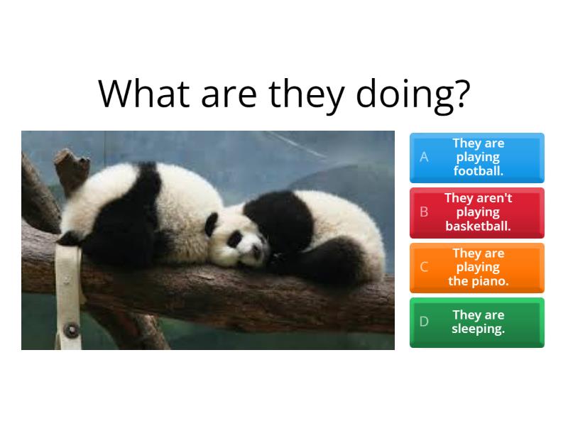 1) What are they doing? a) They are playing football. b) They aren't playing basketball. c) They are playing the piano. d) They are sleeping. 2) What is she doing? a) She isn't cooking. b) She is getting dressed. c) She is cooking. d) She is sleeping. 3) What are you doing? a) I am watching TV. b) I am playing the piano. c) I am cooking. d) I am sleeping. 4) What are we doing? a) We are listening to music. b) We are watching TV. c) We aren't watching TV. d) We are cooking. 5) What is he doing? a) He is watching TV. b) He isn't playing tennis. c) He is cooking. d) He is playing tennis. 6) What are you doing? a) I am drawing. b) I am eating an ice cream. c) I am cooking a sandwich. d) I am getting dressed.