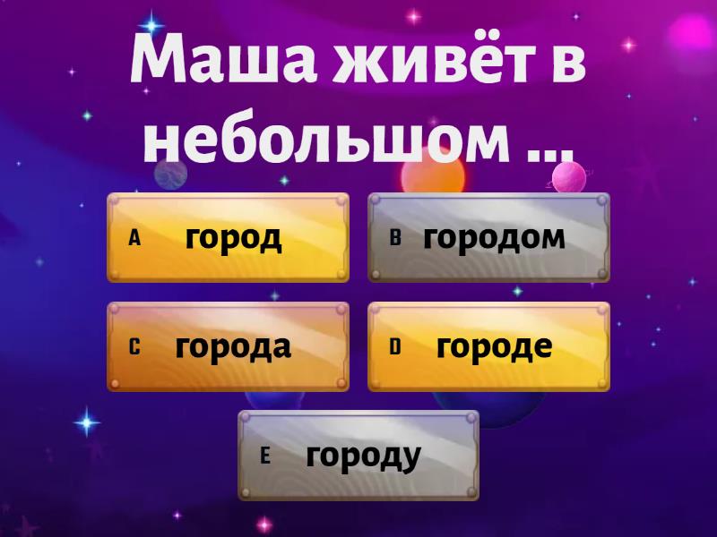 1) Маша живёт в небольшом ... a) город b) городом c) города d) городе e) городу 2) Ей нравится её ... a) город b) городом c) города d) городе e) городу 3) Она любит гулять по ... a) город b) городом c) города d) городе e) городу 4) Но по выходным её семья отдыхает за ... a) город b) городом c) города d) городе e) городу 5) У Маши есть два ... a) брат b) братьев c) брата d) брату e) братья f) братом 6) Её старшему ... десять лет a) брат b) братьев c) брата d) брату e) братья f) братом 7) Её ... очень весёлый a) брат b) братьев c) брата d) брату e) братья f) братом 8) Её старший ... любит компьютеры a) брат b) братьев c) брата d) брату e) братья f) братом 9) Маша ходит в школу вместе с младшим ... a) брат b) братьев c) брата d) брату e) братья f) братом 10) Маше уже семь ... a) год b) лет c) года d) годов 11) Она уже ... ходит в школу a) год b) лет c) года d) годов 12) Ещё она два ... занимается музыкой a) год b) лет c) года d) годов 13) Маша играет на ... и немного на пианино a) скрипка b) скрипку c) скрипке d) скрипкой e) скрипки 14) У неё красивая новая ... a) скрипка b) скрипку c) скрипке d) скрипкой e) скрипки 15) Маша любит ..., но её больше нравится пианино a) скрипка b) скрипку c) скрипке d) скрипкой e) скрипки 16) Она занимается ... два раза в неделю. a) скрипка b) скрипку c) скрипке d) скрипкой e) скрипки 17) У ... есть лучшая подруга a) Маша b) Маши c) Машей d) Маше 18) Машину ... зовут Полина. a) подругу b) подруга c) подругой d) подруги e) подруге 19) Они с ... часто играют вместе a) Маша b) Маши c) Машей d) Маше 20) Машина ... очень весёлая. a) подругу b) подруга c) подругой d) подруги e) подруге 21) Маша часто ходит в гости к своей ... . a) подругу b) подруга c) подругой d) подруги e) подруге
