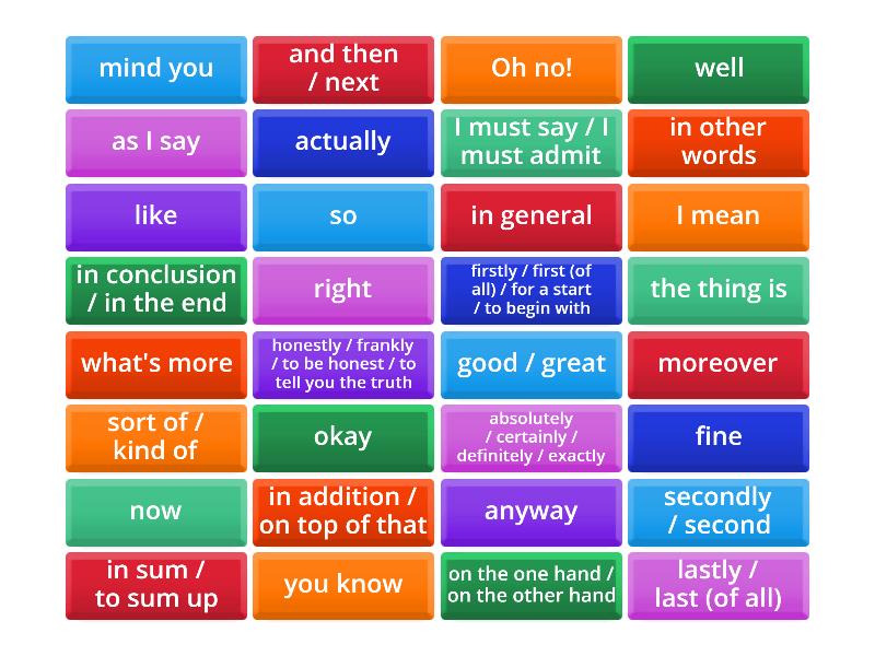 anyway - Anyway, is that it? Has anyone got any questions?, like - I don't really watch TV... like... I watch Netflix but not a regular TV programme., you know - But I am really scared, you know?, right - Right, let’s get started. We need to get the suitcases into the car., fine - Fine, thanks everyone for coming., now - Now, we have with us in the studio today someone you will all know from television. John Rice, welcome to the show., so - So we’ll see you Sunday, Liz., I mean - How important is that? I mean, it seems like it's no big deal to me., good / great - Oh, good!, well - Well, that is a really good question., as I say - As I always say, it is all about communication., okay - Okay, see you then, love., mind you - They provide a good service. Mind you, they charge enough for it., firstly / first (of all) / for a start / to begin with - I don’t think so, Caroline. For a start, she has all the money that her aunt gave her., in addition / on top of that - In addition, we offer a range of benefits for new parents., moreover - She saw that there was indeed a man immediately behind her. Moreover, he was observing her strangely., on the one hand / on the other hand - On the one hand, I really enjoy the episode, on the other hand I can see a lot of issues with the story., secondly / second - Secondly we are going to look at what makes a good essay and what makes a bad one., in conclusion / in the end - In conclusion, walking is a cheap, safe, enjoyable and readily available form of exercise., in sum / to sum up - The meeting was, in sum, a disaster., in general - She had a confused idea of life in general., and then / next - First think, and then speak., what's more - What’s more, she has a good job and she seems to have a good lifestyle., lastly / last (of all) - Lastly, we’re going to do some writing activities., in other words - In other words, I think you have nothing to worry about. Your health seems very good., the thing is - The thing is, my parents like me to be home by 10 o'clock., actually - I think I’ve found a house I’d like to buy. Well it’s an apartment actually. It’s ideal for me., absolutely / certainly / definitely / exactly - Absolutely! I agree., honestly / frankly / to be honest / to tell you the truth - To tell you the truth, I don't really know the answer to that., I must say / I must admit - I must admit, I have never really thought about this., sort of / kind of - I sort of agree with you., Oh no! - Oh no! You can't be serious.,