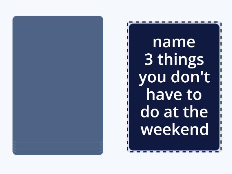 : name 3 things you have to do every day, name 3 things you have to do at work, name 3 things you have to do at the English lesson, name 3 things you don't have to do at work, name 3 things you don't have to do at the weekend, name 3 things you don't have to do at home,