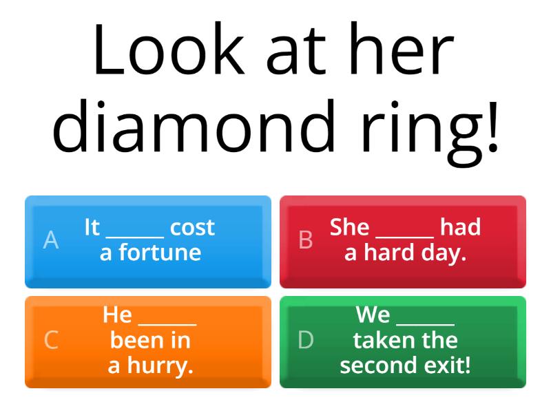 1) Look at her diamond ring! a) It ______ cost a fortune b) She ______ had a hard day. c) He ______ been in a hurry. d) We ______ taken the second exit! 2) Jane is looking very happy. a) She ______ seen a sad film. b) That's lucky. He _____ been killed. c) We ______ taken the second exit! d) She ______ had some good news. 3) I went skydiving on the weekend! a) She ______ studied very hard. b) It ______ been him. He doesn't know the combination. c) It ______ cost a fortune d) That ______ been very exciting. 4) Logan was in a serious car accident, but he's okay. a) That's lucky. He _____ been killed. b) He ______ been redecorating his house. c) Her boss ______ been very happy. d) It ______ cost a fortune 5) Harry has bought a new computer. a) He ______ received a pay rise at work. b) That's lucky. He _____ been killed. c) She ______ had a hard day. d) Someone ______ stolen it! 6) Max has got paint on his hands. a) He ______ waited for us? b) He ______ been redecorating his house. c) It ______ been him. He doesn't know the combination. d) Her boss ______ been very happy. 7) Although the English test was easy, Isabella failed it. a) She ______ studied very hard. b) She ______ had some good news. c) She ______ seen a sad film. d) Someone ______ stolen it! 8) Oh no! Where's my car? a) That ______ been very exciting. b) Someone ______ stolen it! c) That's lucky. He _____ been killed. d) It ______ been Elijah. He told me he really likes you. 9) Emma arrived late for work again yesterday. a) You ______ used a lot of chili. b) He ______ received a pay rise at work. c) She ______ seen a sad film. d) Her boss ______ been very happy. 10) I think Craig stole some money from the safe. a) She ______ studied very hard. b) She ______ had a hard day. c) I think you ______ stayed with Jose. d) It ______ been him. He doesn't know the combination. 11) Jennifer left the cinema crying. a) She ______ seen a sad film. b) She ______ studied very hard. c) That ______ been very exciting. d) He ______ left it at home. 12) Look! Tom's t-shirt is inside out. a) He ______ been in a hurry. b) You ______ used a lot of chili. c) That's lucky. He _____ been killed. d) It _______ been her. She's on holiday in Italy at the moment. 13) Do you know who sent me these flowers? a) It ______ been Elijah. He told me he really likes you. b) She ______ studied very hard. c) Her boss ______ been very happy. d) She ______ had some good news. 14) I saw Ava in the mall yesterday. a) It _______ been her. She's on holiday in Italy at the moment. b) He ______ waited for us? c) He ______ been in a hurry. d) We ______ taken the second exit! 15) Liam hasn't been answering his phone all day. a) It ______ been Elijah. He told me he really likes you. b) That ______ been very exciting. c) He ______ left it at home. d) He ______ been in a hurry. 16) Katie looks very tired. a) She ______ seen a sad film. b) It ______ been Elijah. He told me he really likes you. c) That ______ been very exciting. d) She ______ had a hard day. 17) We're lost! a) We ______ taken the second exit! b) That's lucky. He _____ been killed. c) It _______ been her. She's on holiday in Italy at the moment. d) She ______ had a hard day. 18) This mince is so spicy! a) She ______ seen a sad film. b) She ______ had a hard day. c) Her boss ______ been very happy. d) You ______ used a lot of chili. 19) He's such a nice guy! a) You ______ used a lot of chili. b) He ______ waited for us? c) She ______ seen a sad film. d) I think you ______ stayed with Jose. 20) He left already? That's so rude! a) It ______ been him. He doesn't know the combination. b) He ______ waited for us? c) Someone ______ stolen it! d) I think you ______ stayed with Jose.