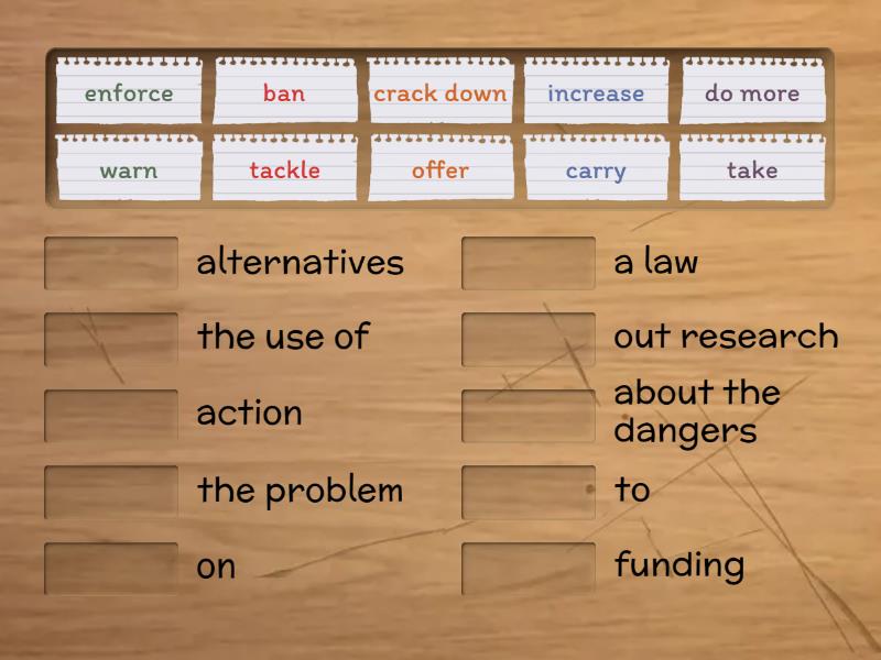 take - action, tackle - the problem, increase - funding, carry - out research, ban - the use of, do more - to, warn - about the dangers, crack down - on, offer - alternatives, enforce - a law,