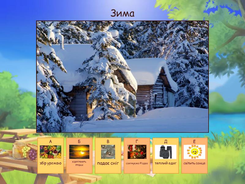 1) Зима a) збір урожаю b) відлітають птахи c) падає сніг d) святкуємо Різдво e) теплий одяг f) світить сонце 2) Весна a) птахи повертаються з вирію b) мороз c) на дереві з`являються листочки d) тане сніг e) жовтіє листя f) зеленіють дерева і квітнуть дерева 3) Літо a) ходити на пляж b) збирати врожай c) багато квітів d) овочі та фрукти e) падає сніг f) світить сонечко 4) Осінь a) опадає листя b) птахи летять у теплі краї c) замерзає річка d) діти йдуть до школи e) збір врожаю f) святкуємо Різдво