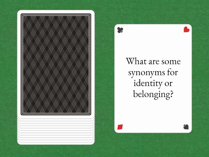 : How would you define identity? What examples can you think of of how people might describe/identify their identity?, How important is it to have a strong sense of identity? Why?, What shapes or impacts how you see yourself?, What is the link between your identity and your sense of belonging?, How do you define belonging?, What are some synonyms for identity or belonging?, What are some examples of groups people belong to?, What are the consequences of feeling like you belong/don’t belong?, How do your friends influence your sense of identity?, Describe a place where you feel you truly belong. Why do you feel this way?, How does your family shape who you are?, Can you think of a time when you felt like an outsider? What made you feel that way?, What hobbies or interests are important to your identity?,