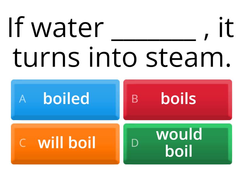 1) If water _______ , it turns into steam. a) boiled b) boils c) will boil d) would boil 2) She will help you with your homework if you ________ her. a) ask b) asked c) will ask d) asking 3) If I ________ more time, I would learn another language. a) have b) had c) will have d) would have 4) If they had studied harder, they ________ the exam. a) would pass b) passed c) will pass d) would have passed 5) Unless it ________, we will go to the beach tomorrow. a) rain b) rains c) will rain d) rained 6) I will go to the party ________ you come with me. a) unless b) as long c) provided that d) when 7) If he sees her, he ________ her the news. a) will tell b) tells c) would tell d) told 8) If I had known the answer, I ________ you. a) tell b) told c) will tell d) would have told 9) If she had gone to bed earlier, she ________ so tired in the morning. a) would not be b) is not c) will not be d) would not have been 10) If I ________ a million dollars, I would travel the world. a) win b) won c) will win d) winning