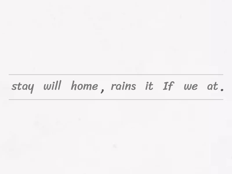 If it rains, we will stay at home., If she studies hard, she will pass the exam., If he doesn't hurry, he will miss the bus., If they invite us, we will go to the party., If you eat too much, you will feel sick., If she saves enough money, she will buy a new phone., If we leave now, we will arrive on time., If he plays well, he will make the team., If you don't water the plants, they will die., If it gets cold, we will turn on the heater., The picnic was canceled because it was raining heavily., She got an A on the test because she studied hard., The dog ate all its food because it was very hungry., They arrived late because the traffic was heavy., She overslept because she forgot to set her alarm., They went hiking because the weather was perfect., She went to bed early because she was very tired., They bought the new TV because they found a great deal online.,