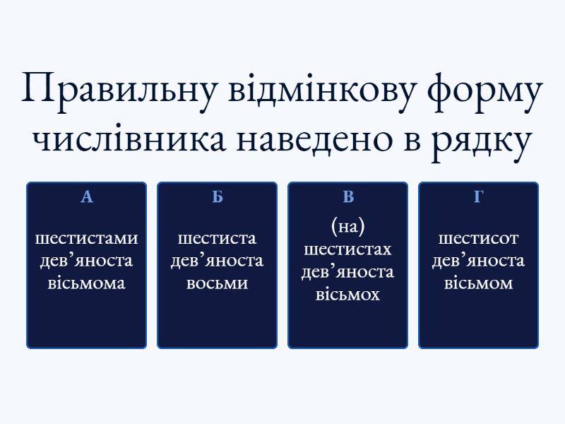 1) Правильну відмінкову форму числівника наведено в рядку a) шестиста дев’яноста восьми b) шестисот дев’яноста вісьмом c) шестистами дев’яноста вісьмома d) (на) шестистах дев’яноста вісьмох 2) Усі відмінкові форми кількісних числівників записано правильно, ОКРІМ a) сьомистами тридцятьма чотирма гривнями b) двумстам п’ятдесяти дев’яти учням c) трьомастами сорока сьома кілограмами d) п’ятьмастами тридцятьма шістьома сторінками e) шестистам вісімдесяти трьом автомобілям 3) Порушено норму відмінювання числівника в рядку a) На змаганнях директор нагородив п’ятьох учнів. b) Швидкість бігу гепарда — від сто двадцяти до сто сорока кілометрів за годину. c) Серед восьмисот сорока семи приток Дніпра є велика річка Прип’тять. d) Прийшовши на спортмайданчик, він зустрів там сімох однокласників. e) Запорозька чайка вміщала від п’ятдесяти до сімдесяти козаків 4) Відмінкову форму числівника вжито правильно в реченні a) Певніші й докладніші відомості про козаків ми знаходимо коло року тисяча п’ятисот п’ятидесятого. b) Якось у тисяча шестисот сорок сьомому році Чаплинський напав зі своїми гайдуками на Суботів. c) Найперші відомості про козаків записані в хроніках і літописах уже в тисяча чотирьохсот дев’яносто другому році. d) Богун виявив талант полководця під час Берестецької битви в червні тисяча шістсот п’ятдесят першого року. e) Запорозька Січ до останніх днів свого існування, тобто до тисячу семисот сімдесят п’ятого року, залишалася острівцем волі. 5) НЕПРАВИЛЬНО утворено відмінкову форму числівника в реченні a) Деякі представники лускатих плазунів мають хребет із чотирьохсот однакових хребців. b) Відомо близько двохсот двадцяти видів черепах із кістковим панциром. c) Досліджено, що швидкість польоту бабки може сягати ста п’ятдесяти кілометрів за годину. d) Динозаври були панівною групою тварин близько шестидесяти мільйонів років тому.