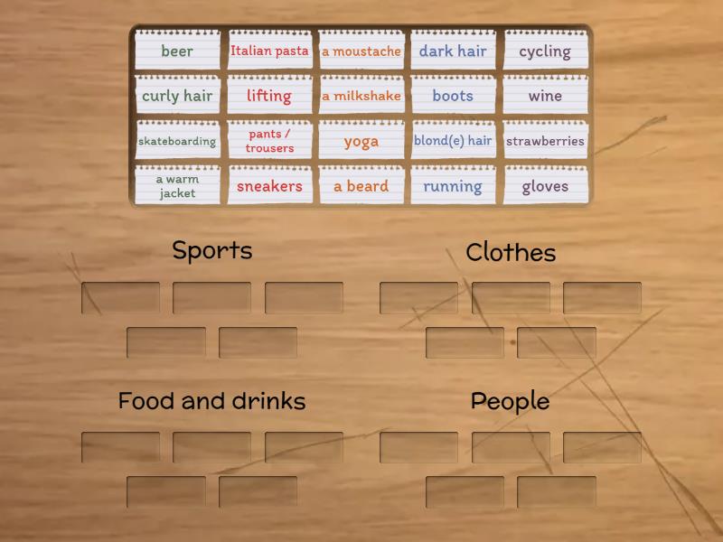 Sports: cycling, running, skateboarding, yoga, lifting, Clothes: sneakers, gloves, boots, a warm jacket, pants / trousers, Food and drinks: a milkshake, wine, beer, strawberries, Italian pasta, People: a beard, a moustache, dark hair, blond(e) hair, curly hair,