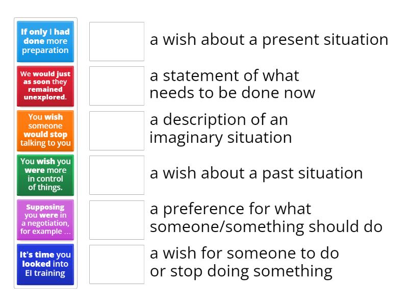 We would just as soon they remained unexplored. - a preference for what someone/something should do, You wish you were more in control of things. - a wish about a present situation, If only I had done more preparation - a wish about a past situation, You wish someone would stop talking to you - a wish for someone to do or stop doing something, It’s time you looked into EI training - a statement of what needs to be done now, Supposing you were in a negotiation, for example … - a description of an imaginary situation,