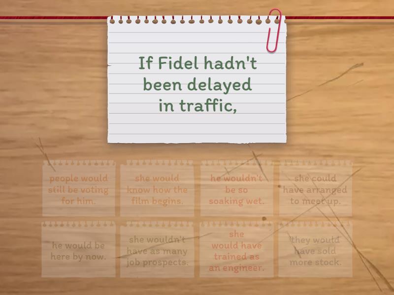 he would be here by now. - If Fidel hadn't been delayed in traffic,, he wouldn't be so soaking wet. - If Hugo had remembered to take a brollie,, she would know how the film begins. - If Patricia hadn't arrived so late at the cinema,, they would have sold more stock. - If Apple share prices were more reasonable,, she could have arranged to meet up. - If Veronica had known her friend were in town tomorrow,, she wouldn't have as many job prospects. - If Hyeonji hadn't studied English,, she would have trained as an engineer. - Had Nelly known how easy it was to find work,, people would still be voting for him. - If the President hadn't gone against his word,,