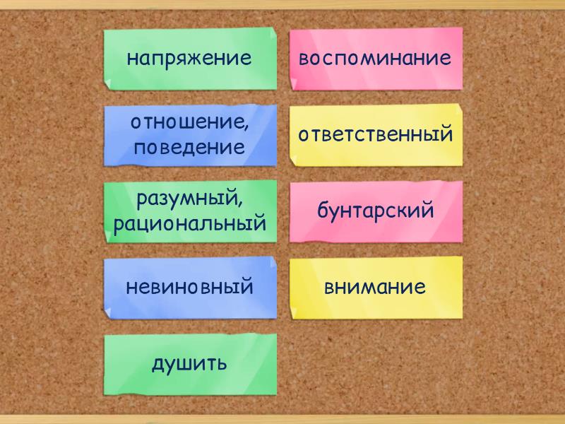 внимание - an attention, напряжение - a tension, бунтарский - rebellious, разумный, рациональный - sensible, душить - to suffocate, воспоминание - a memory(of), отношение, поведение - an attitude, невиновный - innocent, ответственный - responsible,