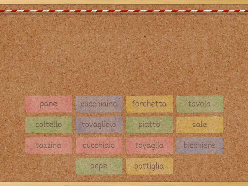 tavola - table, tovaglia - tablecloth, bicchiere - glass, bottiglia - bottle, piatto - plate, cucchiaio - spoon, cucchiaino - teaspoon, forchetta - fork, coltello - knife, tazzina - cup, tovagliolo - napkin, sale - salt, pepe - pepper, pane - bread,