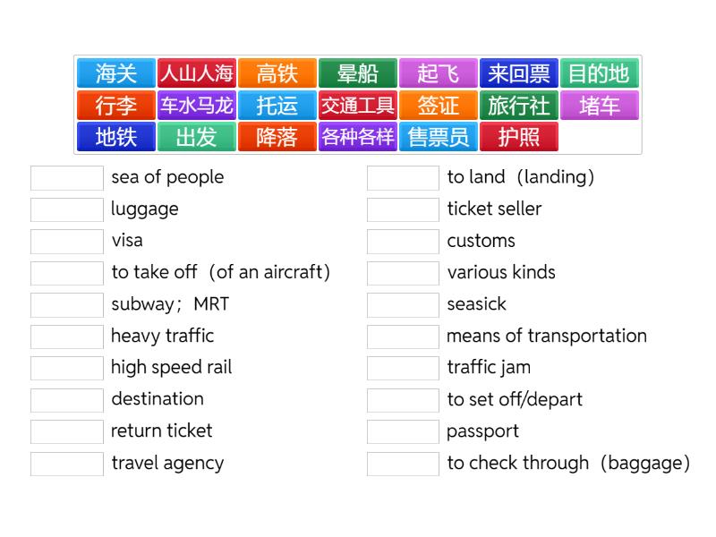 高铁 - high speed rail, 地铁 - subway;MRT, 各种各样 - various kinds, 交通工具 - means of transportation, 签证 - visa, 护照 - passport, 起飞 - to take off(of an aircraft), 托运 - to check through(baggage), 降落 - to land(landing), 晕船 - seasick, 出发 - to set off/depart, 海关 - customs, 堵车 - traffic jam, 行李 - luggage, 目的地 - destination, 人山人海 - sea of people, 车水马龙 - heavy traffic, 来回票 - return ticket, 售票员 - ticket seller, 旅行社 - travel agency,