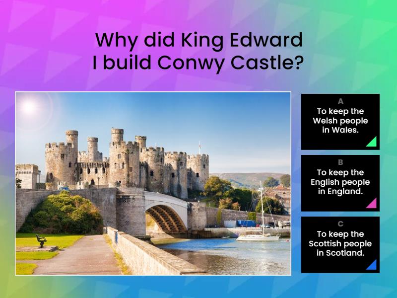 1) Why did King Edward I build Conwy Castle? a) To keep the Welsh people in Wales. b) To keep the English people in England. c) To keep the Scottish people in Scotland. 2) In the Aboriginal language Coober Pedy means _______ . a) a black man in a hole b) a white man in a hole c) a man in a black hole 3) The Taipei 101 Mall looks like a _______ . a) a gondola b) a rainbow c) a Chinese tower 4) What is the Taipei 101 Mall made of? a) wood and metal b) wood and glass c) steel and glass 5) Where is the Taipei 101 Mall? a) in London b) in Taiwan c) in Japan 6) How many people does the Maracana stadium seat? a) 15.000 people b) 150.000 people c) 160.000 people 7) Where can you stay in cave houses under the ground? a) in Mexico City b) in Coober Pedy c) in Rio de Janeiro 8) Which is the fastest means of transport? a) a plane b) a train c) a snowmobile 9) An 'umiaq' is ______ . a) an oil lamp b) an igloo c) a large boat 10) Where is the Loch Ness? a) in Scotland b) in Wales c) in Northern Ireland 11) According to legend, who made the Giant's Causeway in Antrim? a) a Welsh giant b) an English giant c) an Irish giant 12) Which is the largest desert in the world? a) the Congo Desert b) the Sahara Desert c) the Gobi Desert 13) Which city can you tour in gondola? a) London b) Paris c) Venice 14) Where can you see the most famous carnival parade in the world? a) in Rio de Janeiro b) in Mexico City c) in London 15) What does the word 'Inuit' mean? a) ice b) people c) snow 16) Look at the picture. What is it? a) a river b) a lake c) a waterfall 17) Complete the dialogue: Good to see you, Bill. How was your holiday? a) Lucky you! b) I'll pop by this afternoon. c) It was fantastic! 18) Look at the picture. This is _____ . a) a gondola b) a ferry c) a rickshaw