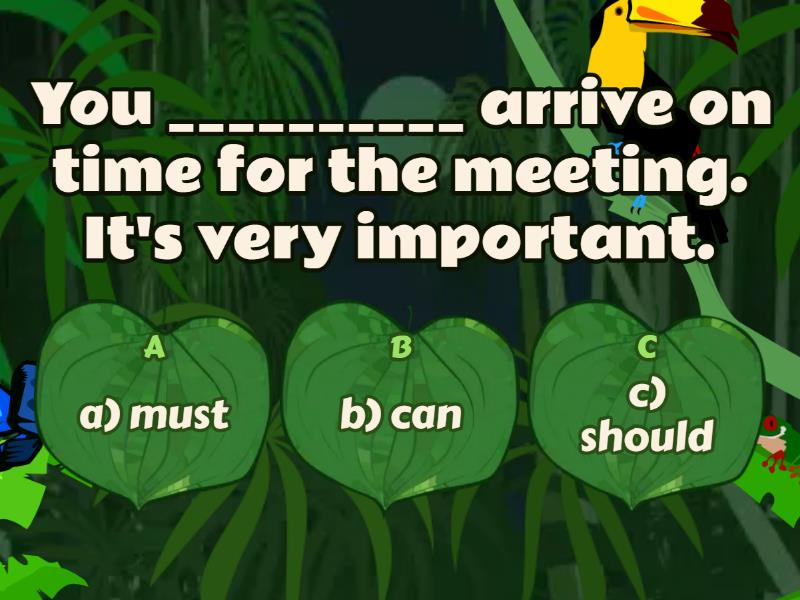 1) You __________ arrive on time for the meeting. It's very important. a) a) must b) b) can c) c) should 2) They __________ finish the project by Friday because it's the deadline. a) a) don't have to b) b) must c) c) shouldn't 3) We __________ work on the weekend if we finish everything by Friday. a) a) can b) b) don't have to c) c) mustn't 4) She __________ attend the conference next week. It's not mandatory. a) a) must b) b) doesn't have to c) c) should 5) You __________ smoke in the office. It's against the rules. a) a) can b) b) mustn't c) c) have to 6) What __________ you do to prepare for an important presentation? a) a) must b) b) can c) c) should 7) We __________ forget to send the email to the client today. a) a) can b) b) shouldn't c) c) mustn't 8) He __________ work overtime to meet the deadline. a) a) has to b) b) can c) c) shouldn't 9) You __________ bring your own lunch. There is a cafeteria in the office. a) a) don't have to b) b) should c) c) mustn't 10) They __________ discuss the new project during the meeting tomorrow. a) a) can b) b) must c) c) have to