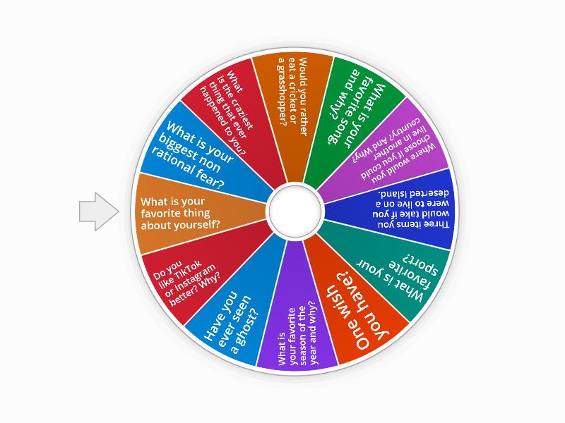 1) What is your biggest non rational fear? 2) What is the craziest thing that ever happened to you? 3) Would you rather eat a cricket or a grasshopper? 4) What is your favorite song, and why? 5) Where would you choose if you could live in another country? And Why? 6) Three items you would take if you were to live on a deserted island. 7) What is your favorite sport? 8) One wish you have? 9) What is your favorite season of the year and why? 10) Have you ever seen a ghost? 11) Do you like TikTok or Instagram better? Why? 12) What is your favorite thing about yourself?