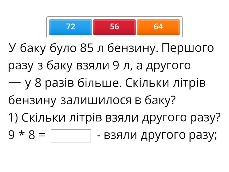 У баку було 85 л бензину. Першого разу з баку взяли 9 л, а другого — у 8 разів більше. Скільки літрів бензину залишилося в баку? 1) Скільки літрів взяли другого разу? 9 * 8 = ____ - взяли другого разу; У баку було 85 л бензину. Першого разу з баку взяли 9 л, а другого — у 8 разів більше. Скільки літрів бензину залишилося в баку? 2) Якщо другого разу взяли 72 л, то скільки ВСЬОГО літрів бензину взяли? 9 + 72 = ____ (л) - взяли всього; У баку було 85 л бензину. Першого разу з баку взяли 9 л, а другого — у 8 разів більше. Скільки літрів бензину залишилося в баку? 3) Якщо було 85 л бензину, а взяли всього 81л , то скільки залишилося? 85 - 81 = ____ (л) - залишилося.