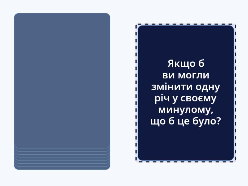 : Що ви вважаєте своїм найбільшим досягненням у житті?, Якби у вас було безмежно багато грошей та часу, чим б ви хотіли займатися у житті?, Які три речі завжди піднімають вам настрій, коли ви почуваєтеся погано?, Хто, на вашу думку, має найбільший вплив на те, ким ви стали сьогодні?, Якби ви могли повторити один момент у своєму житті, що б ви обрали і чому?, Яке переконання ви маєте, з яким не погоджується багато людей?, Якщо б ви могли змінити одну річ у своєму минулому, що б це було?, Яка мрія, від якої ви відмовились, але все ще думаєте про неї?, Яку ціль ви поставили перед собою та активно працюєте над її досягненням?,