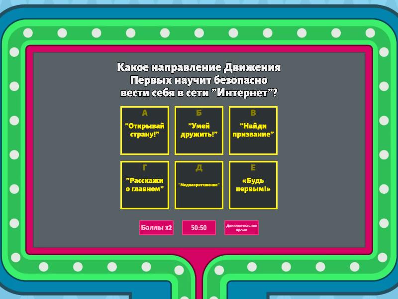 1) Какое направление Движения Первых научит безопасно вести себя в сети "Интернет"? a) "Открывай страну!" b) "Умей дружить!" c) "Найди призвание" d) "Расскажи о главном" e) "Медиапритяжение" f) «Будь первым!» 2) Кому можно доверить свой логин и пароль от страницы Движения Первых? a) Председателю Совета Первых b) Другу c) Однокласснику d) Другу из отряда в лагере "Сибирская сказка" e) Соседу f) Куратору первичного отделения 3) Расшифруй ID: a) Номер страницы на сайте Движения Первых b) Уникальный двоичный код c) Иди вперед! d) Порядковый номер e) Уникальный идентификационный номер f) Собственный идентификационный номер 4) В каком всероссийском конкурсе активисты Движения Первых Кузбасса стали победителями в августе 2024 года? a) "Русский медвежонок" b) "Золотое перо" c) "Медиацентры, вперед!" d) "Юнкор года" e) "ТОП Блог" f) «МедиаПритяжение» 5) Как называется телеканал Движения Первых? a) "Новости Первых " b) "ДВИЖ" c) "МедиаБУМ" d) "Новости Движения" e) "Первые новости" f) «Первый» 6) Где был опубликован селфи - репортаж Морозовой Виктории о том, как Первые Крапивинского округа ходили в поход? a) КиберПервые b) Кузбасс - онлайн c) СТС - Кузбасс d) Вести Кузбасс e) Новости Первых f) Россия -1 7) «Расскажи о главном!» – чему посвящено это направление? a) Спорт b) Наука и технологии c) Культура и искусство d) Здоровый образ жизни e) Туризм и путешествия f) Медиа и коммуникации 8) Одноклассник скинул тебе ссылку и попросил подписаться и проголосовать. По какой ссылке ты пройдешь без раздумия? a) "Сайт Движения Первых " b) "ВКонтакте" c) «Ни по какой» d) "Telegram" e) "WhatsApp" f) Платформа "Твое будущее - здесь!"
