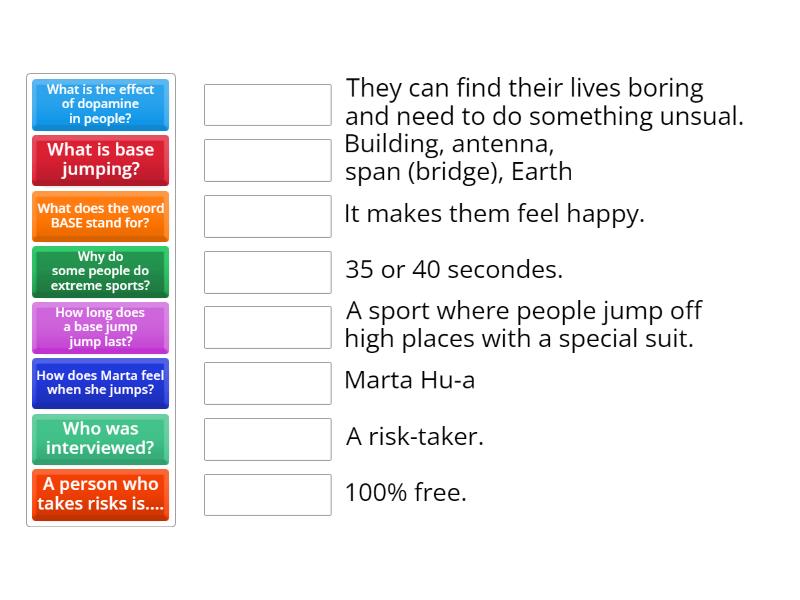 Who was interviewed? - Marta Hu-a, What is base jumping? - A sport where people jump off high places with a special suit., What does the word BASE stand for? - Building, antenna, span (bridge), Earth, Why do some people do extreme sports? - They can find their lives boring and need to do something unsual., What is the effect of dopamine in people? - It makes them feel happy., How long does a base jump jump last? - 35 or 40 secondes., How does Marta feel when she jumps? - 100% free., A person who takes risks is.... - A risk-taker.,