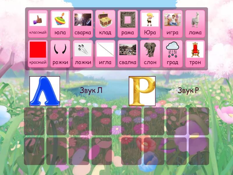Звук Л: лама, клад, ложки, классный, Юра, слон, свалка, игла, Звук Р: рама, град, рожки, красный, юла, трон, сварка, игра,