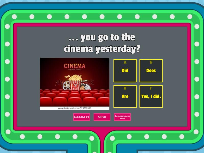 1) ... you go to the cinema yesterday? a) Did b) Does c) Are d) Yes, I did. 2) What film did you.... ? a) saw b) see c) seen d) not see 3) ......it interesting? a) Did b) Were c) Was d) Am 4) Did you ....fun? a) has b) make c) have d) had 5) ....did you go with? - With my friends. a) What b) When c) Who d) Why 6) Did you .....tickets online? a) buy b) bought c) baught d) buyed 7) Did you ...... any food with you? a) took b) take c) taken d) taked 8) Did you have nice seats? - Yes, ......... a) Yes, we did. b) No, we didn't. c) No, we aren't d) Yes, we do 9) .... you share your impressions about the film? a) Does b) Did you c) Do d) Did 10) Did your parents want to see this film too? a) No, they didn't b) No, they don't c) Yes, why not not? d) No problem