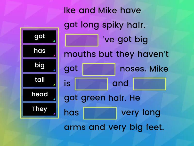 Ike and Mike have got long spiky hair. ____ ’ve got big mouths but they haven’t got ____ noses. Mike is ____ and ____ got green hair. He has ____ very long arms and very big feet.