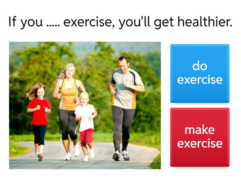 1) If you ..... exercise, you'll get healthier. a) do exercise b) make exercise 2) Shhh!...Don't ... The baby's sleeping. a) make a noise b) do a noise 3) I always ... on Saturday. a) make the washing b) do the washing 4) Oh no! I ..... in my final exam. a) do a mistake b) made a mistake 5) The man who started Facebook ..... before he was 30. a) did millions b) made millions 6) Can I use your phone? I need to .... a) make a phone call b) do a phone call 7) My sister is .... at university. She might graduate next year. a) making a course b) doing a course 8) What's the best way to...? a) make friends b) do friends 9) After a busy week at work, would you choose to... at the weekend? a) make nothing b) do nothing 10) When I leave university, I really want to ... I love. a) do a job b) make a job