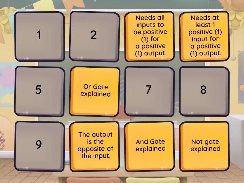 Not gate explained - The output is the opposite of the input., And Gate explained - Needs all inputs to be positive (1) for a positive (1) output., Or Gate explained - Needs at least 1 positive (1) input for a positive (1) output., And Gate, Or Gate, Not Gate,