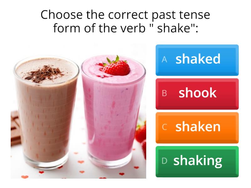 1) Choose the correct past tense form of the verb " shake": a) shaked b) shook c) shaken d) shaking 2) Which one is the correct past participle of the verb " show"? a) showed b) shown c) showeden d) showing 3) Select the correct past tense form of the verb " sing": a) singed b) sang c) sung d) singing 4) Choose the correct past participle of the verb " sit": a) sat b) sitted c) sit d) sitting 5) Which is the correct past tense of the verb " speak"? a) speaked b) spoke c) spoken d) speaking 6) Select the correct past tense form of the verb "spend": a) spend b) spended c) spent d) spending 7) Which one is the correct past participle of the verb " stand"? a) standed b) stood c) standing d) standen 8) Choose the correct past tense form of the verb "stick": a) sticked b) stuck c) stick d) sticking 9) Select the correct past tense form of the verb " swim": a) swimmed b) swam c) swum d) swimming 10) Which one is the correct past participle of the verb " take"? a) take b) took c) taken d) taking 11) Choose the correct past tense form of the verb " teach": a) teached b) taught c) teaching d) tought 12) Select the correct past tense form of the verb " tell": a) said b) telling c) telled d) told 13) Which one is the correct past participle of the verb "think"? a) thinked b) thoght c) thought d) thaught 14) Choose the correct past tense form of the verb " throw": a) throwed b) threw c) thrown d) throwing 15) Select the correct past tense form of the verb " try": a) tryed b) tried c) traied d) trayed 16) Choose the correct past tense form of the verb " wear": a) wore b) wored c) worn d) weared 17) Select the correct past tense form of the verb " win": a) winned b) won c) wined d) woned 18) What is the -ing form of the word ''to swim''? a) swimming b) swiming