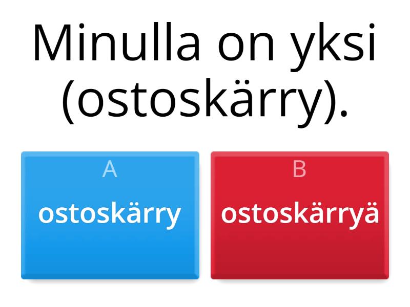 1) Minulla on yksi (ostoskärry). a) ostoskärry b) ostoskärryä 2) Minulla on kaksi (vuoronumero). a) vuoronumero b) vuoronumeroa 3) Minulla on (kassi). a) kassi b) kassia 4) Minulla on kolme (kuitti). a) kuittia b) kuitti 5) Minulla ei ole (kuitti). a) kuitti b) kuittia 6) Minulla ei ole (kortti) mukana. a) kortti b) korttia 7) Meillä ei ole (pyykinpesuaine). a) pyykinpesuainetta b) pyykinpesuaine 8) Meillä ei ole (viinirypäle). a) viinirypäle b) viinirypälettä 9) Meillä ei ole (leikkele). a) leikkele b) leikkelettä 10) Tuotteella ei ole (takuu). a) takuu b) takuuta 11) Meillä ei ole (voi). a) voita b) voi 12) Minulla on kaksi (leivos). a) leivos b) leivosta 13) Tuotteella ei ole (alennus). a) alennusta b) alennus