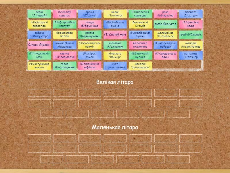 Вялікая літара: (М/м)ірскі замак, (Н/н)обелеўская прэмія, (Т/т)олеў мяч, (А/а)лесіны кеды, (К/к)ітайская сцяна, (К/к)андратавы байкі, маляўнічае (П/п)алессе, (К/к)олеў сшытак, кінатэатр "(М/м)ір", сабака "(М/м)ухтар", верш "(Г/г)ерой", (Н/н)алібоцкая пушча, планета (С/с)атурн, (В/в)асілёва паліто, горад (М/м)аладзечна, рака (Б/б)ярэзіна, часопіс "(Б/б)еларусь", веласіпед (А/а)нтона, (Н/н)іагарскі вадаспад, драма "(С/с)оль", Маленькая літара: (Н/н)обелеўскі лаўрэат, (А/а)ўстралійскі кенгуру, (С/с)лонімскія каўбасы, (Б/б)атумскія вуліцы, (Ч/ч)ыгуначны вакзал, кветка (Дз/дз)ьмухавец, (П/п)ушкінскія казкі, (П/п)алескія краявіды, малады (А/а)рхітэктар, белавежскі (З/з)убр, грыб (Б/б)аравік, школа (І/імя) Машэрава, куст (Ш/ш)ыпшыны, ягады (Б/б)русніцы, Слуцкі (Р/р)аён, вопытны (А/а)граном, новы (П/п)іяніст, вопытны (Т/т)рэнер, рыба (В/в)угор, кветка (Г/г)ладыёлус,
