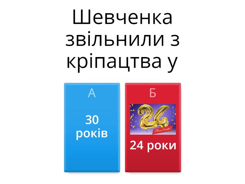 1) Шевченка звільнили з кріпацтва у a) 30 років b) 24 роки