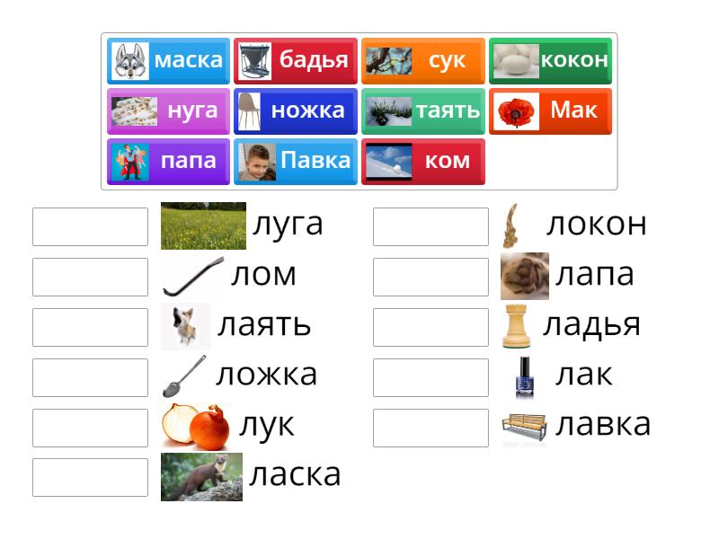 Мак - лак, сук - лук, ком - лом, нуга - луга, папа - лапа, Павка - лавка, ножка - ложка, маска - ласка, кокон - локон, бадья - ладья, таять - лаять,