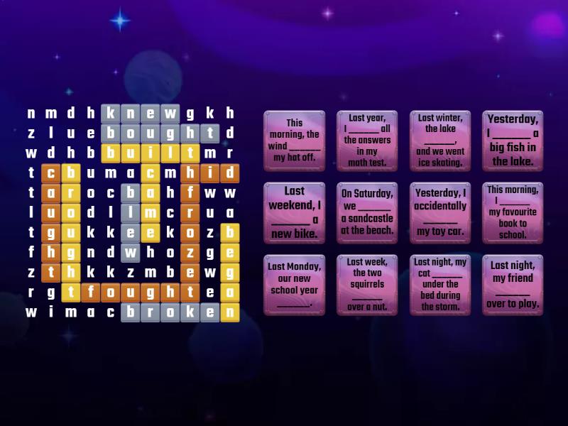 came - Last night, my friend ______ over to play., broke - Yesterday, I accidentally ______ my toy car., fought - Last week, the two squirrels ______ over a nut., built - On Saturday, we ______ a sandcastle at the beach., blew - This morning, the wind ______ my hat off., hid - Last night, my cat ______ under the bed during the storm., began - Last Monday, our new school year ______., knew - Last year, I ______ all the answers in my math test., froze - Last winter, the lake ______, and we went ice skating., brought - This morning, I ______ my favourite book to school., bought - Last weekend, I ______ a new bike., caught - Yesterday, I ______ a big fish in the lake.,