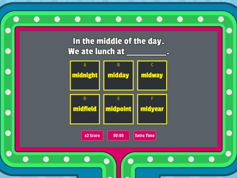 1) In the middle of the day. We ate lunch at __________. a) midnight b) midday c) midway d) midfield e) midpoint f) midyear 2) The centre of the sports field. The girls were playing ___________ positions in their baseball team. a) midnight b) midday c) midway d) midfield e) midpoint f) midyear 3) In the middle of something. Peter stopped ______ down the street. a) midnight b) midday c) midway d) midfield e) midpoint f) midyear 4) Twelve o'clock at night. The boys were asleep at _________. a) midnight b) midday c) midway d) midfield e) midpoint f) midyear 5) In July. We went to the ____________ sales at the shops. a) midnight b) midday c) midway d) midfield e) midpoint f) midyear