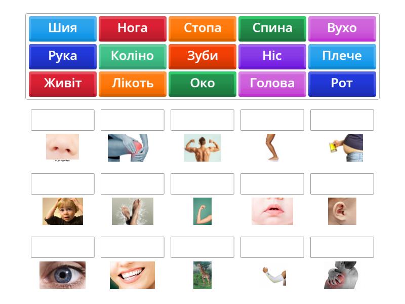 Голова, Ніс, Око, Вухо, Рот, Рука, Нога, Зуби, Спина, Плече, Лікоть, Живіт, Стопа, Шия, Коліно,