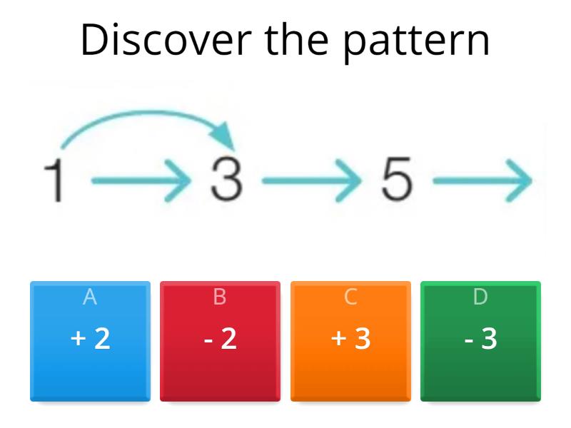 1) Discover the pattern a) + 2 b) - 2 c) + 3 d) - 3 2) Discover the pattern a) + 2 b) - 2 c) + 3 d) - 3 3) Discover the pattern a) + 4 b) - 4 c) + 5 d) - 5 4) Complete the pattern a) 7 - 8 - 10 b) 7 - 9 - 12 c) 7 - 9 - 11 d) 8 - 10 - 12 5) Complete the pattern a) 15 - 12 - 9 b) 15 - 18 - 21 c) 14 - 17 - 20 d) 14 - 16 - 19 6) Complete the pattern a) 25 - 30 - 35 b) 16 - 11 - 6 c) 15 - 11 - 5 d) 15 - 10 - 5