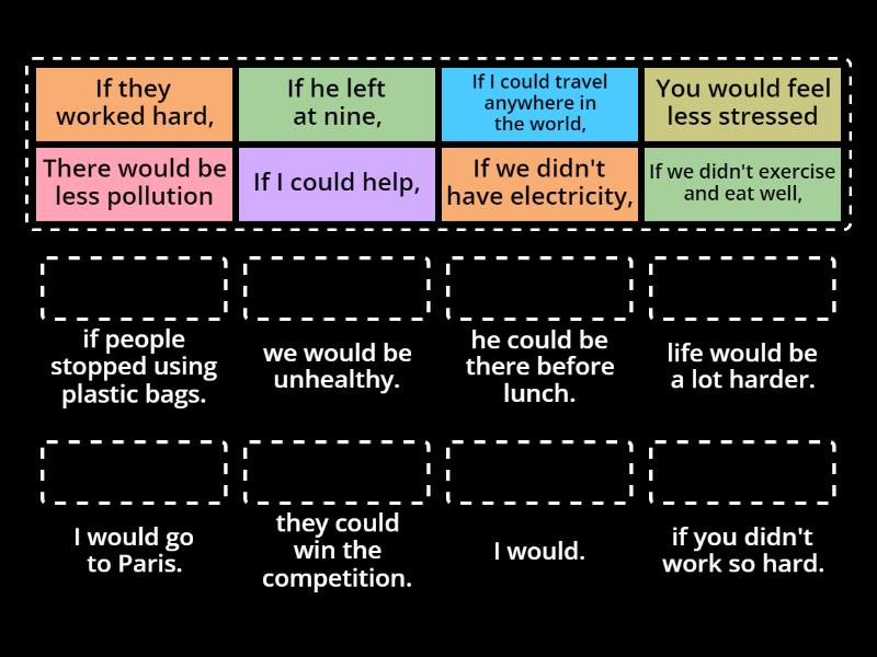If they worked hard, - they could win the competition., If he left at nine, - he could be there before lunch., If I could help, - I would. , If we didn't exercise and eat well, - we would be unhealthy., You would feel less stressed - if you didn't work so hard., If we didn't have electricity, - life would be a lot harder., There would be less pollution - if people stopped using plastic bags., If I could travel anywhere in the world, - I would go to Paris.,